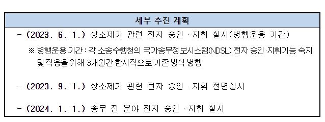 법무부는 전자승인·지휘체계의 원활한 이행과 정착을 위하여 2023. 4. 6일부터 5. 12일까지 총 6회의 전국 광역자치단체 권역별 순회 설명회 등을 실시했고, 5월 중 중앙행정기관 대상 추가 설명회 및 교육영상 배포 등을 실시할 예정이다.