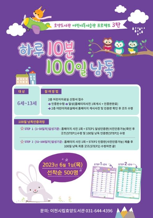 [제주교통복지신문 김강석 기자] 이천시 효양도서관은 어릴 때부터 책 읽는 즐거움을 느끼며 자발적인 독서습관 고취를 위한 어린이독서습관 프로젝트 3탄 ‘하루 10분 100일 낭독’을 운영한다.