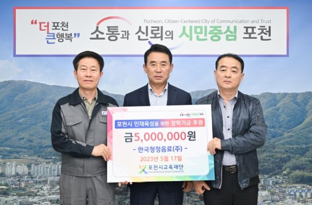 [제주교통복지신문 김강석 기자] (재)포천시교육재단(이사장 백영현)은 지난 17일 한국청정음료㈜(대표 류장)에서 장학금 5백만 원을 기탁했다고 밝혔다.