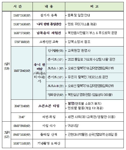5.26일 첫째 날은 ‘통일텐트 꾸미기’와 ‘남북음식 나누기’ 및 ‘토크쇼’를 진행하고, 5.27일 둘째 날은 근현대사 박물관과 순국선열묘역 순례길 등 둘레길 산책 등의 일정으로 구성했다.