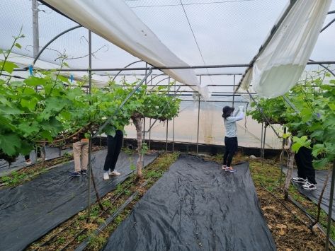 5월 이르게 찾아온 무더운 날씨에도 불구하고 평생교육원 직원 10여 명은 인력난을 겪고 있는 포도 농가를 돕기 위해 적극적으로 나서서 힘을 보탰다.