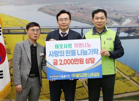 기탁된 물품은 백미10kg 350포, 자사 라면 제품과 도시락 등 선물꾸러미 600박스(총 2000만원 상당)으로 ㈜팔도라면 서울본사, 나주공장 임직원으로 구성된 팔도나눔봉사단 성금 모금을 통해 마련됐다.