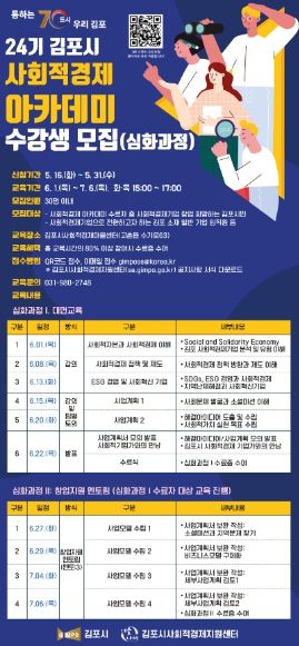 [제주교통복지신문 김강석 기자] 김포시는 오는 31일까지 ‘제24기 김포시 사회적경제 아카데미’ 수강생을 모집한다.