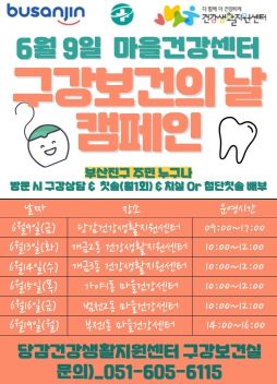 또한 6월 13일부터 6월 19일까지 부산진구 내 마을건강센터 5곳에서도 동일한 구강건강 서비스를 제공하며, 마을건강센터별 일정은 다음과 같다.