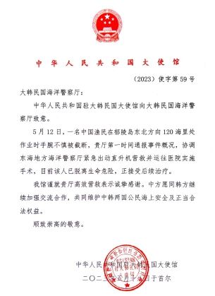 이에, 주한 중국 대사관에서는 감사 서한을 통해 “귀청의 적극적인 구조에 진심으로 감사드립니다. 중국은 한국 측과 함께 계속적으로 교류와 협력을 강화하고 양국 국민들의 해상안전과 정당 합법적인 권익을 수호할 것입니다. 다시 한번 숭고한 경의를 표한다”고 전했다.