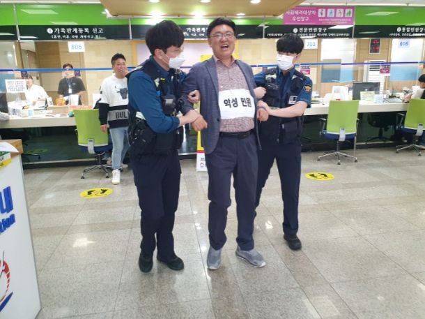 이번 훈련은 민원실에서 발생할 수 있는 폭언·폭행 등 비상상황에 대비해 민원인과 공무원을 보호하고, 현장대응 능력을 높이기 위해 민원담당공무원, 경찰 등 10여명이 참여한 가운데 실시됐다.