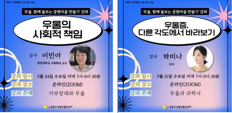 강좌와 워크숍은 우울증을 겪고 있거나 우울감을 느끼는 사람 등 우울에 관심이 있는 누구나 참여할 수 있다. 강좌 참여 신청은 중랑구성평등활동센터 공식 홈페이지와 블로그에서 할 수 있으며, 워크숍 참여 모집은 6월 중 실시할 예정이다.
