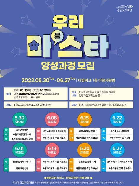 수원시는 마을지원관 학교인 ‘마을 마스타 과정’을 5월 30일부터 6월 27일까지 8회에 걸쳐 수원도시재단 1층 더함사랑방에서 운영한다.