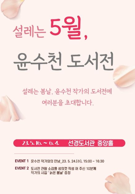 [제주교통복지신문 김강석 기자] 수원시 선경도서관이 6월 4일까지 도서관 1층 중앙홀에서 윤수천 작가의 동화와 시집 등을 소개하는 ‘윤수천 도서展’을 개최한다.