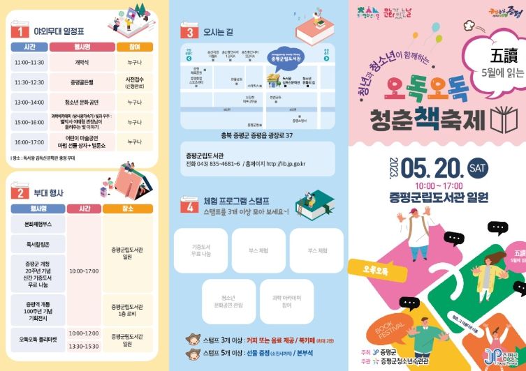 [제주교통복지신문 김강석 기자] 증평군은 5월 20일(토) 증평군립도서관 일원에서 ‘오독오독 청춘 책축제’를 개최했다.