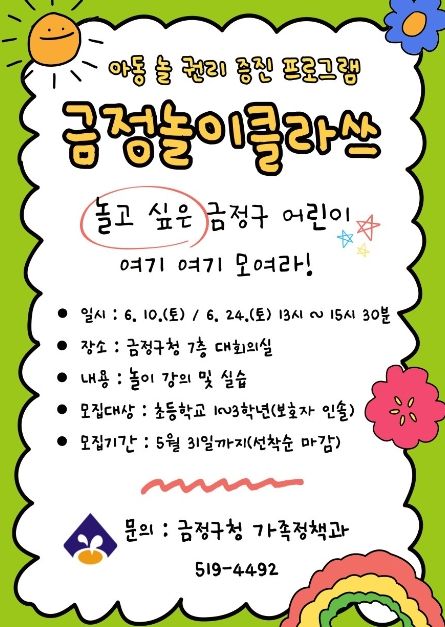 [제주교통복지신문 김강석 기자] 부산 금정구는 아동 놀 권리 증진사업'금정놀이클라쓰'사업 참가자를 모집한다. 이번 사업은 게임·미디어 과몰입과 학업에 편중된 아동의 놀이 시간 부족을 해소하고, 아동의 놀 권리 증진을 위해 마련됐다.