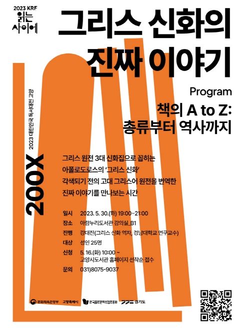 [제주교통복지신문 김강석 기자] 고양특례시 아람누리도서관은 오는 5월 30일 저녁 7시 '책의 A to Z: 총류부터 역사까지' 세 번째 시간으로 '그리스 신화의 진짜 이야기'를 통해 강대진 교수와의 만남을 진행한다.