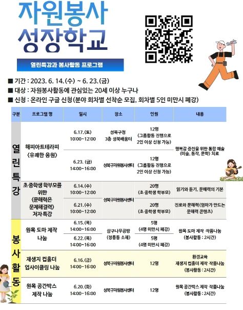 자원봉사 성장학교는 20세 이상 지역주민이면 누구나 신청 및 참여가 가능하며, 온라인 구글 폼을 통해 신청하면 된다. 2023. 5. 18.(목) ~ 6. 10.(토) 기간 동안 분야 및 회차별 선착순 모집이며, 수강료 및 재료비는 무료다.