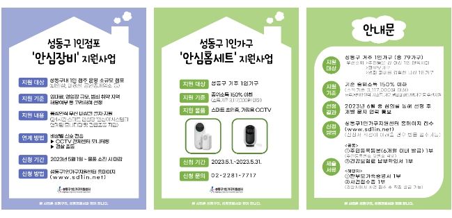 성동구는 지난해 여성 1인가구 ‘안심홈세트’(이중잠금장치, 휴대용 비상벨, 가정용 CCTV) 및 여성 1인점포 ‘안심비상벨’ 지원사업을 추진, 102가구, 7개 점포를 지원하여 구민들의 큰 관심과 호응을 얻은 바 있다.