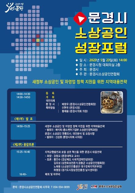 [제주교통복지신문 김강석 기자] 경상북도 소상공인연합회 문경시지회는 23일 문경시청 대회의실에서 '문경시 소상공인 성장포럼'을 개최한다.