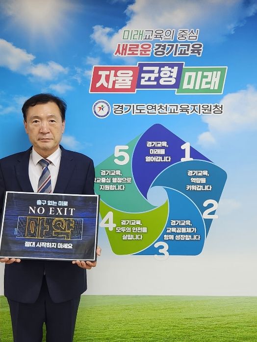 [제주교통복지신문 김강석 기자] 연천교육지원청 안선근 교육장이 18일 ‘NO EXIT’ 마약 예방 릴레이 캠페인에 참여했다.