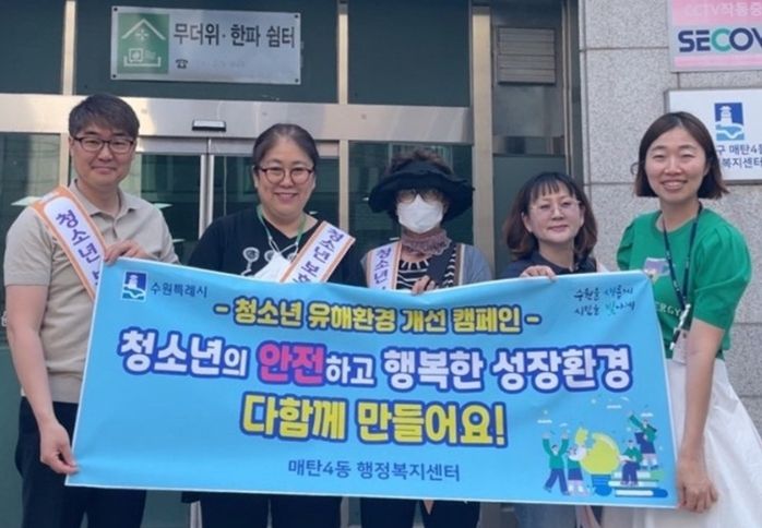 [제주교통복지신문 김강석 기자] 수원시 영통구 매탄4동 행정복지센터는 18일 청소년지도위원 및 관계 공무원 등 5명이 참여하여 청소년 유해환경 단속 및 개선 캠페인을 진행했다.