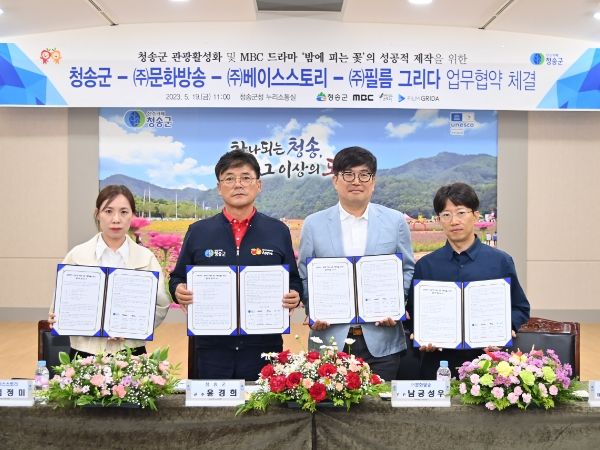 [제주교통복지신문 김강석 기자] 청송군은 5월 19일 군청 누리소통실에서 ㈜문화방송, ㈜베이스스토리, ㈜필름 그리다와 드라마 제작지원을 통한 산소카페 청송군 관광 활성화 및 MBC 드라마 ‘밤에 피는 꽃’의 성공적 제작을 위한 업무협약(MOU)을 체결했다.