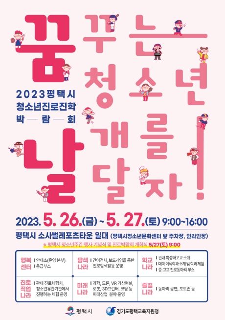 이번 2023 평택시 청소년진로진학박람회 ‘꿈날’은 코로나로 인하여 3년 만에 대면으로 개최하게 됐으며, 올해 처음으로 맞이하는 ‘제1회 평택시 청소년의 날’ 기념식과 함께 진행함에 따라 더욱더 의미 있는 행사가 될 예정이다.
