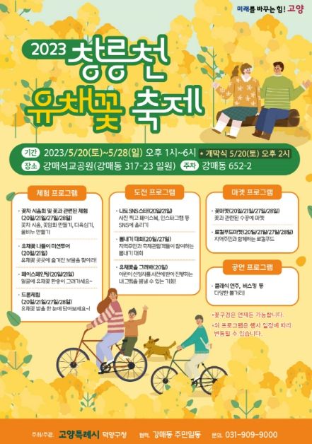 [제주교통복지신문 김강석 기자] 고양특례시는 오는 20일부터 28일까지 9일간 창릉천 강매석교공원(강매동 317-23 일원)에서 ‘창릉천 유채꽃축제’가 열린다고 밝혔다.