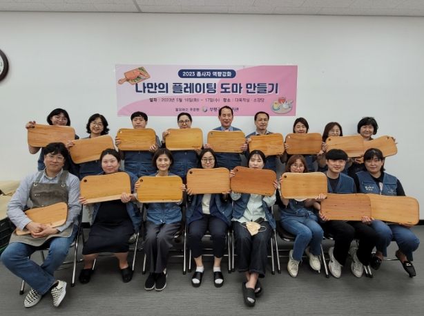 역량강화 교육은, 孝도마 작업 전에 위생적인 식생활 문화 교육과 도마 샌딩, 도마 관리법, 우드 버닝체험 등으로 진행되어 직원들에게 심리적인 안정감을 제공하고 가정에 유용한 나만의 도마를 만드는 기회를 가졌다.