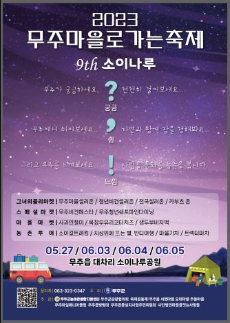 [제주교통복지신문 김강석 기자] 제9회 무주 마을로 가는 축제가 오는 27일 막을 올린다. 6월 3일~5일에도 무주읍 대차리 소이나루공원 일대에서 개최된다. 6월 축제는 제11회 무주산골영화제(6.2.~6. 무주군 일원)기간에 열려 1석 2조의 효과를 기대해 볼 수 있겠다.