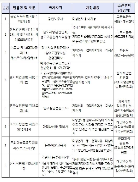 개정안의 주요 내용을 살펴보면, 공인노무사 자격시험의 응시 결격사유에서 미성년자를 제외하고, 정수시설운영관리사 등 10개 자격의 결격사유에서 미성년자 등 연령을 제한하는 결격사유를 삭제한다. 또한, 마리나선박 정비사 등 9개 국가자격의 결격사유의 적용 시점을 자격취득 절차의 마지막 단계인 자격증 발급일 등으로 명시해 미성년자 등 자격취득 결격사유 대상자가 미리 관련 시험에 응시하거나 교육을 이수할 수 있음을 명확히 한다.