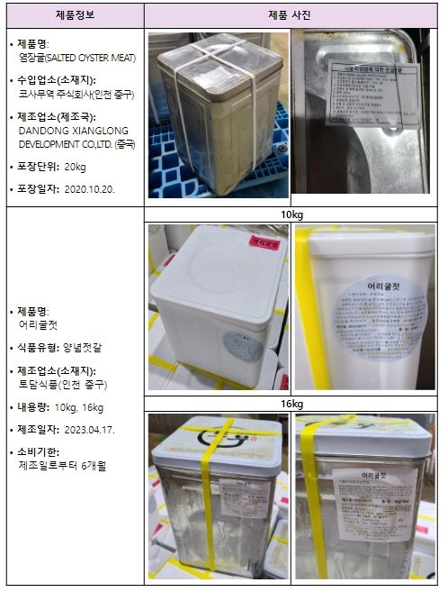 회수 대상은 포장일자가 ‘2020.10.20.’로 표시된 염장굴과 제조일자가 ‘2023.04.17.’로 표시된 어리굴젓 제품이다.