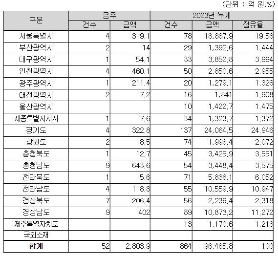 지역별로는 충청남도 644억 원, 인천광역시 460억 원, 경상남도 402억 원, 그 밖의 지역이 1,298억 원이다.