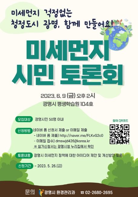 토론회는 미세먼지에 관심 있는 광명시민이라면 누구나 참석할 수 있으며, 5월 26일까지 시청 누리집(gm.go.kr)을 통해 50명 선착순으로 신청받는다.