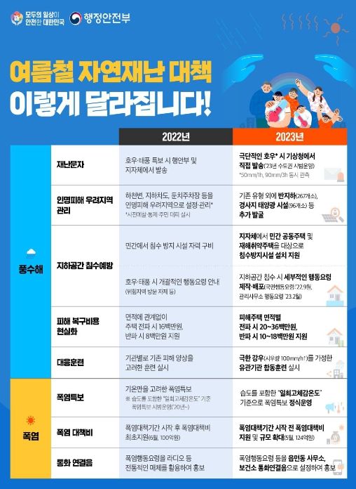 행정안전부는 19일 정부 합동으로 여름철 자연재난(풍수해, 폭염) 대책을 수립하고 자연재난 대책 기간*동안 하천변·지하차도·둔치주차장 등 인명피해가 우려되는 5,397개소를 집중관리 등 인명과 재산피해를 최소화한다고 밝혔다.