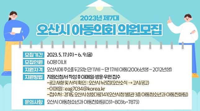 [제주교통복지신문 김강석 기자] 오산시가 아동의 소리와 의견이 반영되는 시정을 위해 5월 17일부터 6월 9일까지 제7대 아동의회 의원 60명을 모집한다.