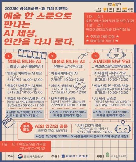 [제주교통복지신문 김강석 기자] 부산 사상도서관은 문화체육관광부가 주최하고 한국도서관협회가 주관하는 ‘2023년 도서관 길 위의 인문학’ 공모사업에 선정돼 오는 6월부터 9월까지 프로그램을 운영한다.