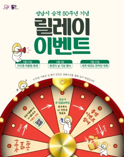 시 승격 50주년 홍보 릴레이는 21일 열리는 ‘지구촌 어울림축제’를 시작으로 6월 ‘환경의 날’ 행사, 7월 ‘세계 태권도 한마당’ 등으로 이어진다. 릴레이 홍보 행사 관련 상세한 목록과 내용은 성남시 홈페이지에서 확인할 수 있다.