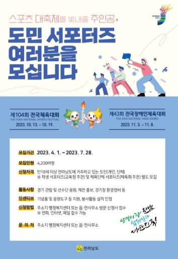 [제주교통복지신문 김강석 기자] 화순군은 제104회 전국체전 및 제43회 전국장애인체전의 성공을 위해 군민 서포터즈 70명을 모집한다고 19일 밝혔다.