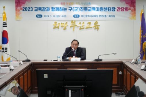 [제주교통복지신문 김강석 기자] 하윤수 부산광역시교육감이 17일 오후 4시 시교육청 제1회의실에서 센터장과 교육청 관계자들이 참석한 가운데 열린 ‘2023년 구(군)진로교육지원센터장 간담회’에서 인사말을 하고 있다.