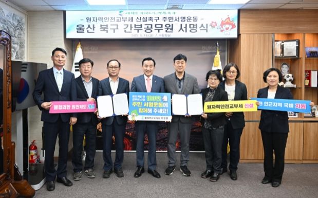 [제주교통복지신문 김강석 기자] 울산 북구는 19일 구청장실에서 원자력안전교부세 신설 촉구를 위한 서명운동 참여 분위기 조성을 위해 간부공무원 서명식을 열었다.