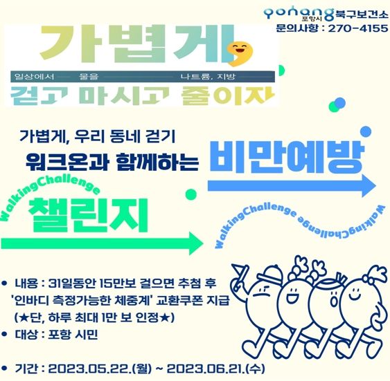 [제주교통복지신문 김강석 기자] 포항시 북구보건소는 5월 22일부터 6월 21일까지 한 달간 ‘가볍게 걷고 마시고 줄이자’를 슬로건으로 전국 합동 캠페인의 일환인 비만 예방 걷기 챌린지를 진행한다.