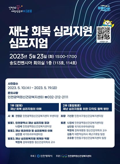 [제주교통복지신문 김강석 기자] 인천광역시는 재난 회복심리지원을 위한 다각도 협력 방안 모색을 위한 ‘2023 재난 회복심리지원 심포지엄’을 5월 23일 오후 3시 송도컨벤시아에서 개최한다고 밝혔다.