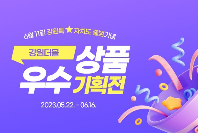 강원도 대표 온라인 쇼핑몰 ‘강원더몰’에서는 6월 11일 강원특별자치도 출범을 기념하여 오는 5월 22일부터 6월 16일까지 출범기념 기획전을 실시한다.