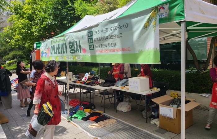 지난 19일 동 행정복지센터 입구에서 진행된 행사에서 협의회원들은 주민들이 미리 기증한 의류와 잡화 등 중고물품을 1000원에 판매했다.