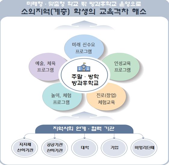 주말·방학 방과후학교는 학생이 온전한 삶의 주체로 성장하도록 주말과 여름방학동안 학교 밖에서 진행되는 돌봄과 진로 등 다양한 프로그램으로 참여를 희망하는 초·중·고 학생들을 대상으로 지역사회 기관과 연계하여 운영하는 방과후 교육활동이다.