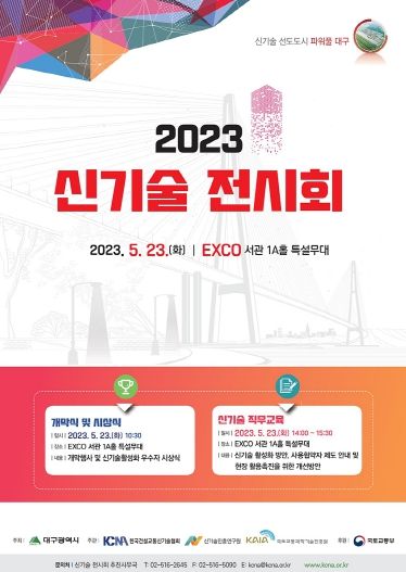 대구광역시가 주최하고 한국건설교통신기술협회·신기술진흥연구원·국토교통과학기술진흥원이 공동 주관하는 ‘2023 신기술 전시회’는 2019년 이후 세 번째로 개최되며, 건설·교통·환경 분야 신기술을 체험하고 대구신기술플랫폼 등록 신기술, 정부인증신기술(NET), 혁신제품 등 다양한 신기술 전시를 통한 정보교류의 장으로 활용할 수 있는 전문전시회이다.