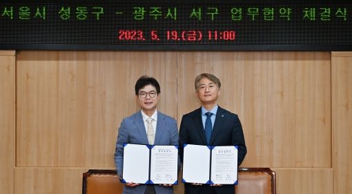 [제주교통복지신문 김강석 기자] 광주광역시 서구와 서울특별시 성동구가 지역민 삶의 질 향상과 지역의 공동발전을 위해 손을 맞잡았다. 김이강 서구청장과 정원오 성동구청장은 19일 성동구청에서 상생발전 업무협약을 체결했다.