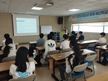 이날 청소년참여예산학교는 청소년이 직접 참여하는 주민참여예산에 대한 이해도를 높이기 위해 진천군주민참여예산위원회 사무국장(김은선)의 소양교육과 사업 발굴, 제안 등을 실습하는 과정으로 진행됐다.