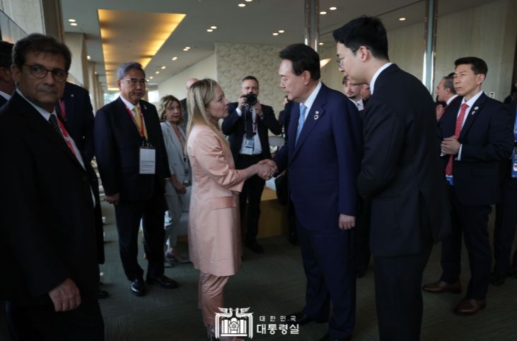 [제주교통복지신문 김강석 기자] 윤석열 대통령은 5. 20일 G7 정상회의 단체사진 촬영 후, 이탈리아 역사상 최초의 여성 총리인 조르자 멜로니 총리와 약식 환담을 가졌다.