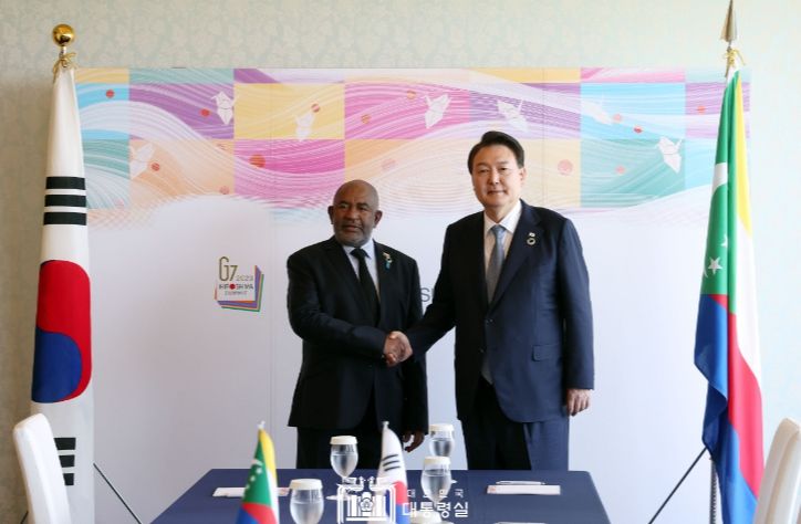 [제주교통복지신문 김강석 기자] 윤석열 대통령은 5. 21일 오전 히로시마 G7 정상회의 참석 계기에 아프리카연합(AU) 의장 자격으로 G7 정상회의에 참석한 아잘리 아쑤마니(Azali Assoumani) 코모로 대통령과 정상회담을 가졌다.