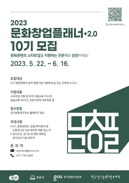 ‘문화창업플래너’ 모집에 대한 자세한 사항은 경기콘텐츠진흥원 누리집에서 확인할 수 있으며, 사업 담당자에게 문의하면 된다.
