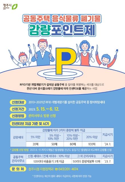 [제주교통복지신문 김강석 기자] 청주시는 음식물쓰레기 배출량 저감을 위해 음식물류폐기물 감량포인트제 신청가구를 모집한다고 22일 밝혔다.