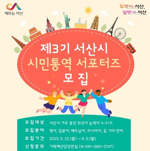 [제주교통복지신문 김강석 기자] 충남 서산시는 외국어에 능통한 시민을 대상으로 22일부터 6월 5일까지 ‘제3기 서산시 시민통역 서포터즈’를 확대 모집한다고 밝혔다.